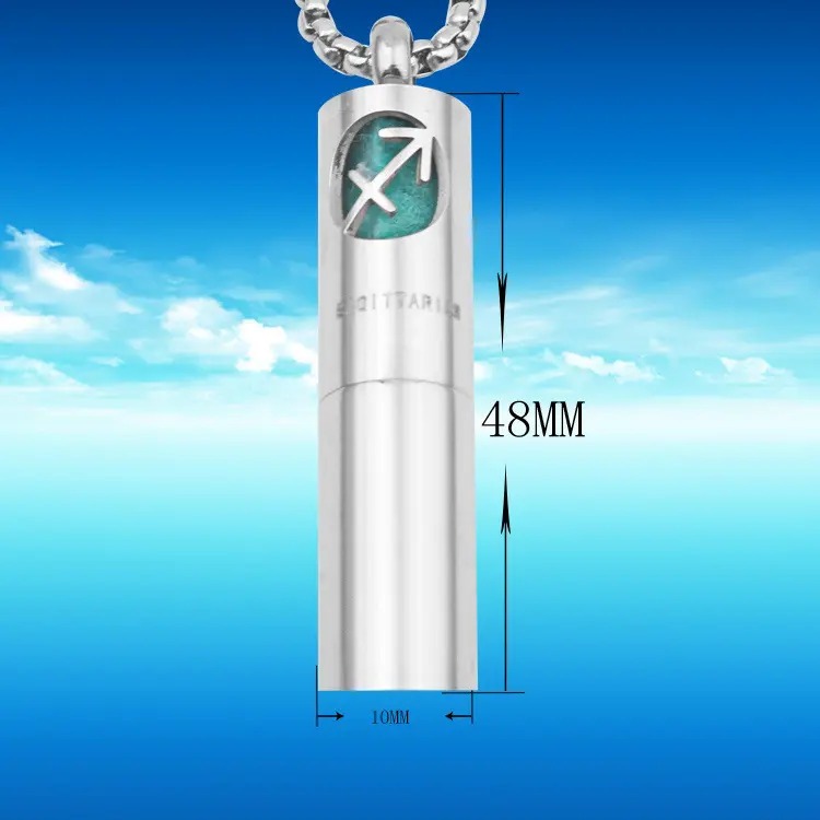Magas minőségű (316l, élelmiszer biztonságú), rozsdamentes nemes acél aroma tároló és párologtató szelence, rajta horoszkóp szimbólum kivágás, nemes acél lánccal.