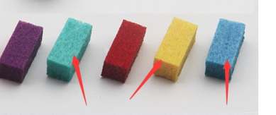 A terméket 5 db szivaccsal szállítjuk: sárga, kék, türkiz színben. (A képen nyíllal jelölve.)