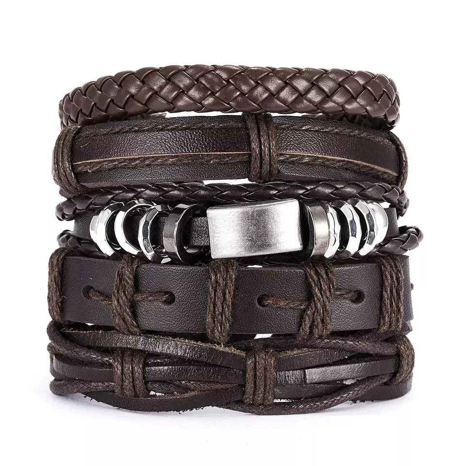 Barna, valódi bőr karkötő szett, amely tulajdonképpen öt különálló karkötő, melyek stílusukban összeillenek.