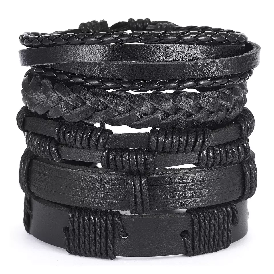 Fekete, valódi bőr karkötő szett, amely tulajdonképpen öt különálló karkötő, melyek stílusukban összeillenek.