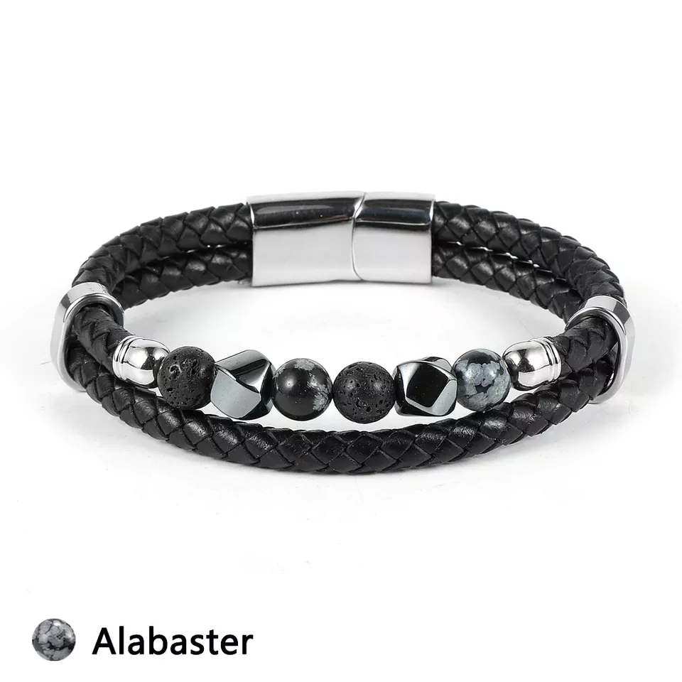 Fekete, bőr karkötő, valódi ásványokkal, rozsdamentes acél csattal.