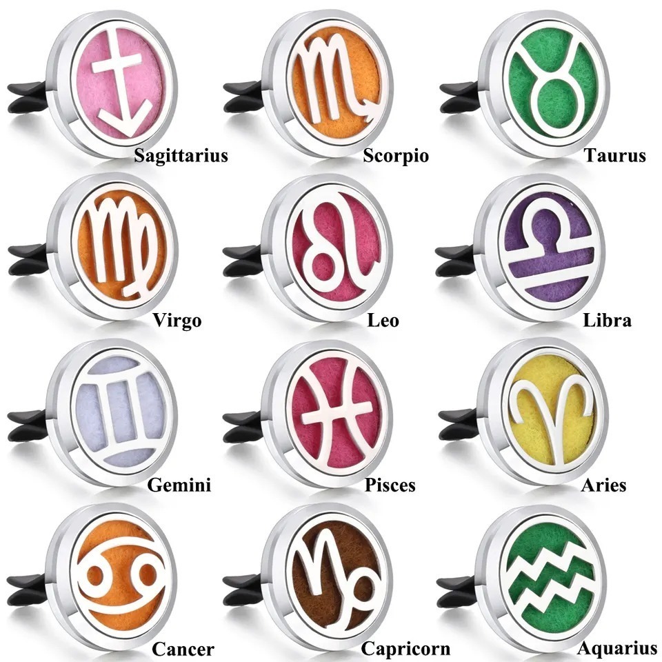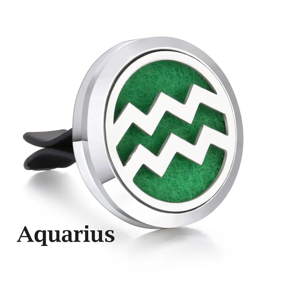 Utántölthető autó illatosító, aroma, illóolaj, vagy parfüm párologtatására, horoszkóp, asztrológiai jegy szimbólummal.