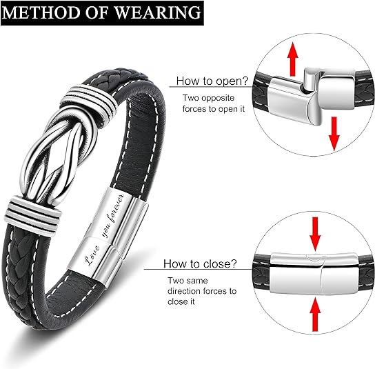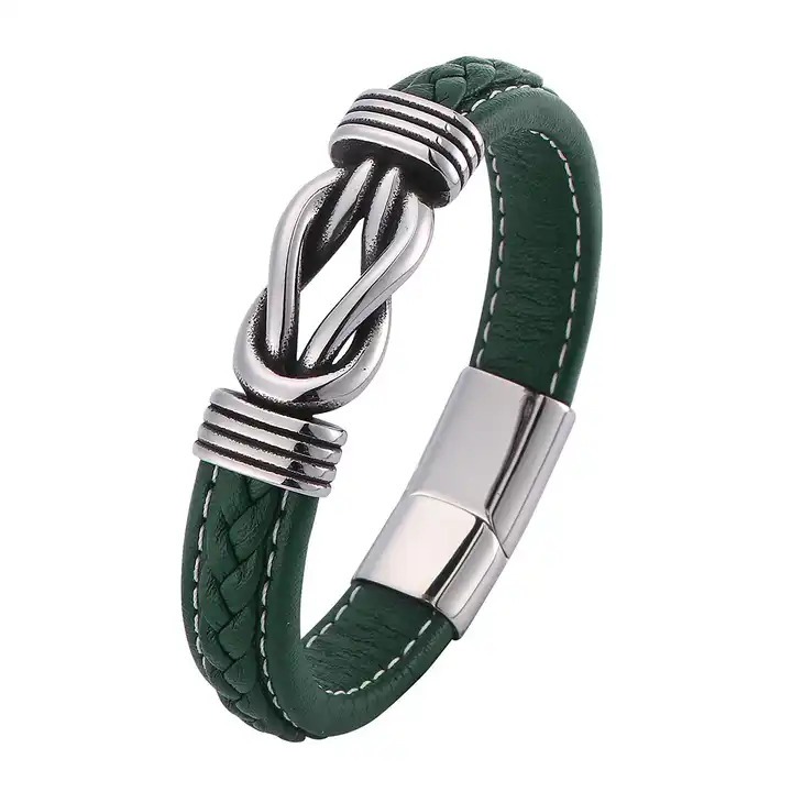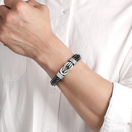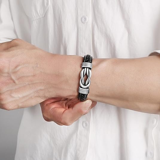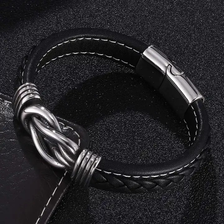 Fekete színű, bőr karkötő, szépen kidolgozott, rozsdamentes nemes acél csomóval és kapoccsal záródik.