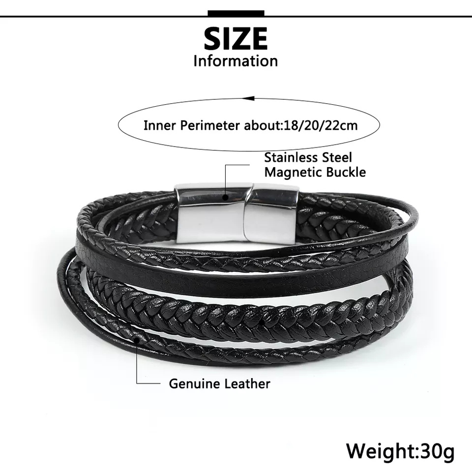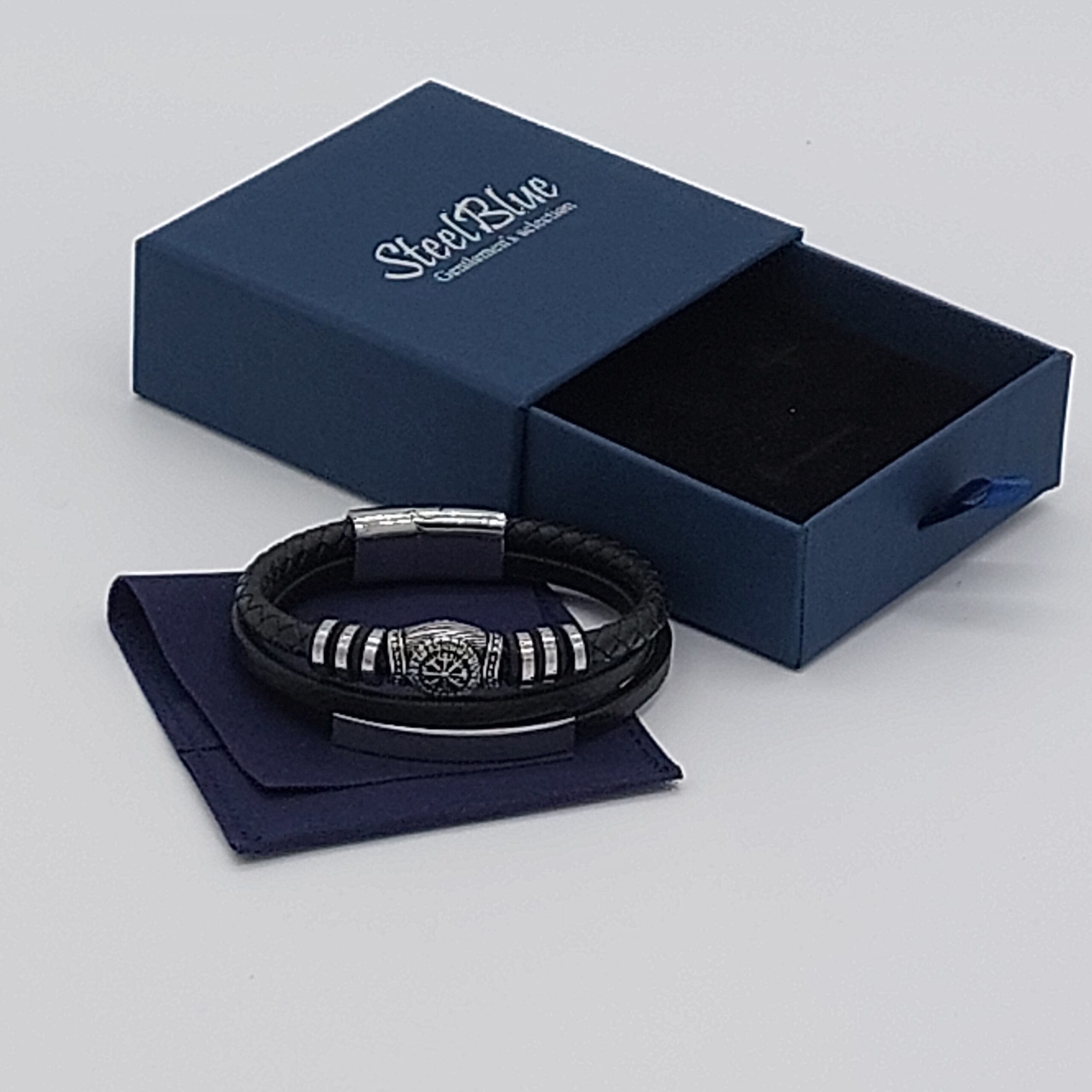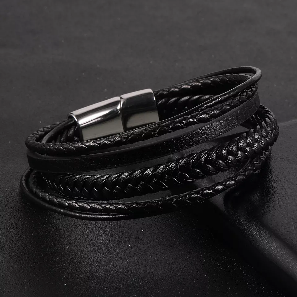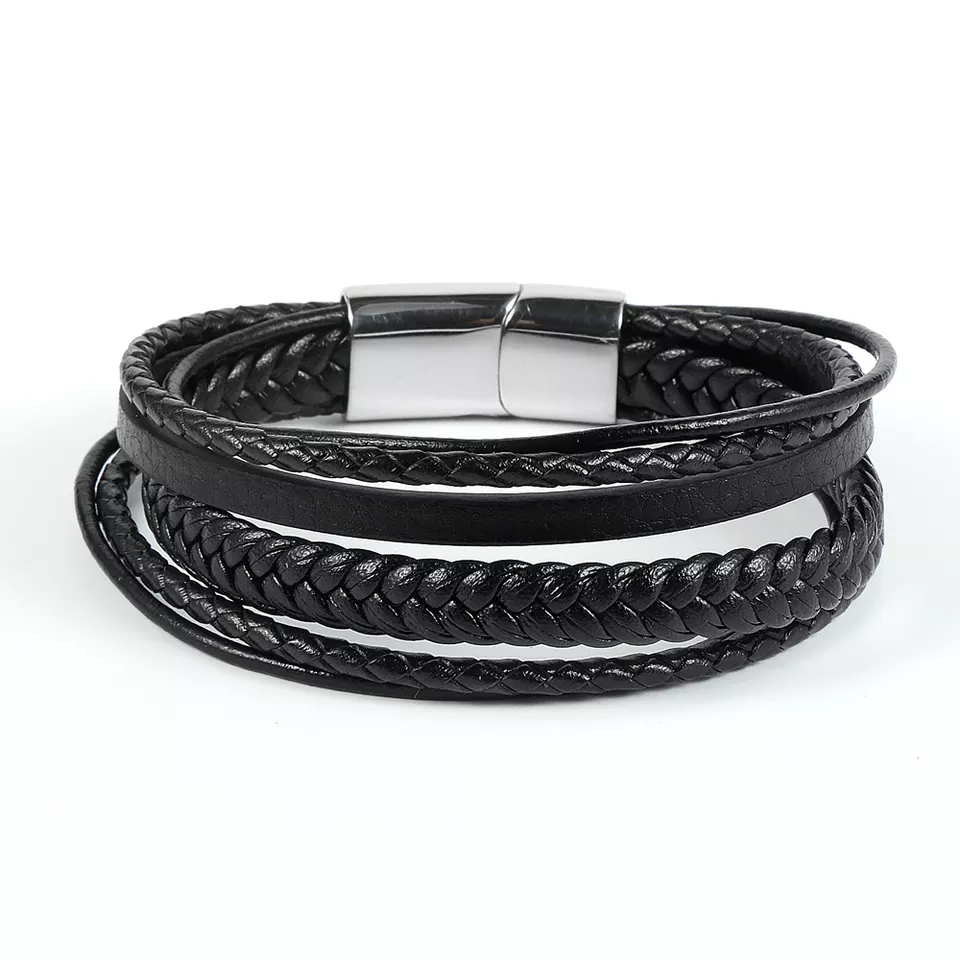 Több soros, fekete bőr karkötő, rozsdamentes acél csattal.