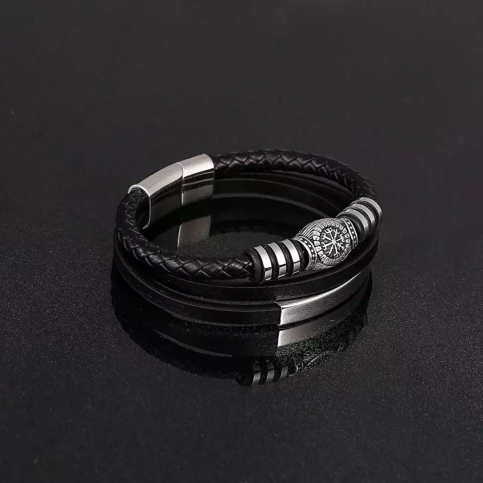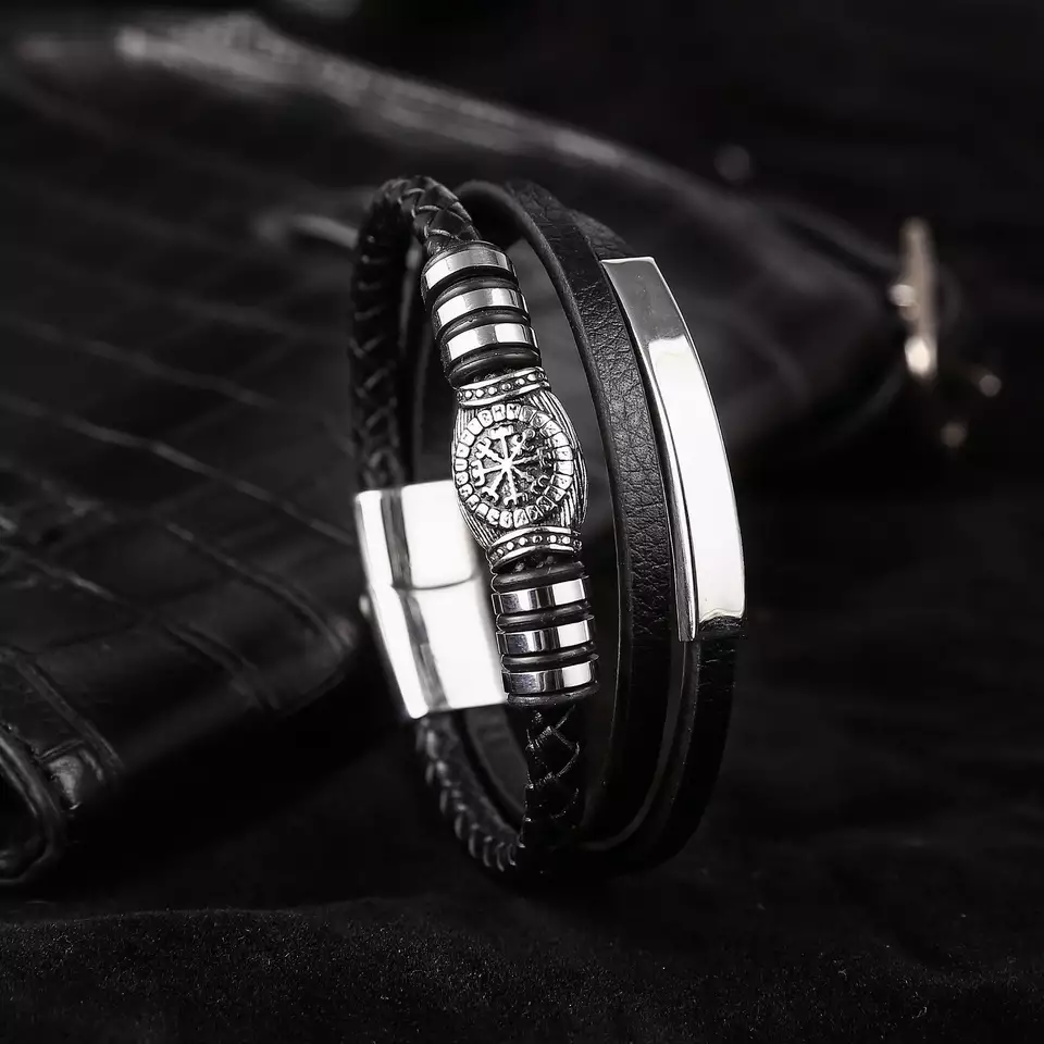 Fekete, valódi bőr karkötő kollekció, amely három részből áll. Az elsőn egy rozsdamentes, akár gravírozható rátét, a középső egy tiszta bőr, a harmadikon pedig a Vegvisir, avagy a viking iránytű szimbólum, rúna látható.